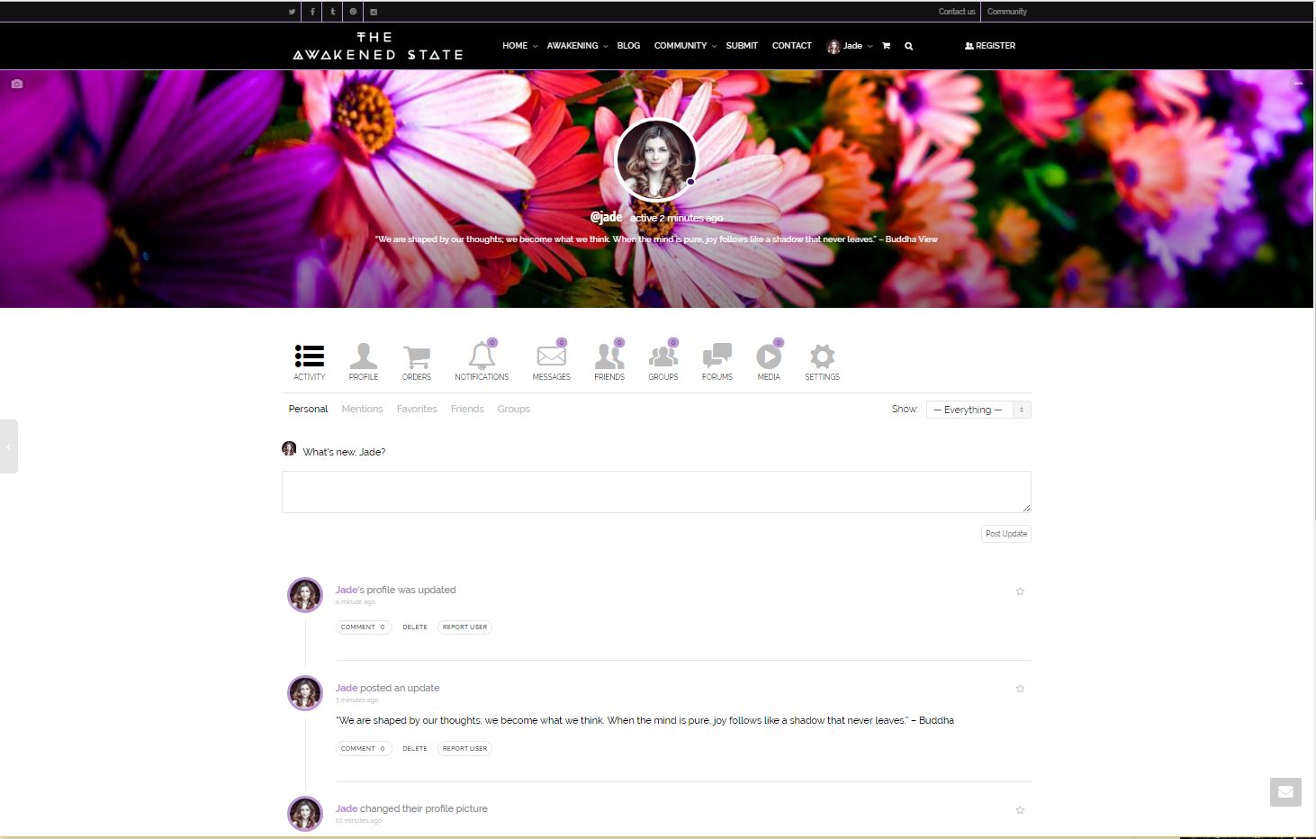 Inspired from facebook’s newsfeed, this theme includes a special activity feed where you can post updates, concerns or just share a thought with us in the community. This a unique feature because rather than focusing on a bunch of different things on fb the awakened state activity feature is based around all the topics you personally enjoy with people who are spiritually oriented. (plus won’t think you’re crazy 😉 )